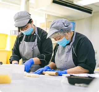また、施設周辺の羽津地区では、生活困窮者の方を対象に、運営するパン屋「ベーカリーショップブルーミング」で焼いたパンの配布を行う「パンdeサークル」を企画し、地域の方と共に配布作業を行っています。