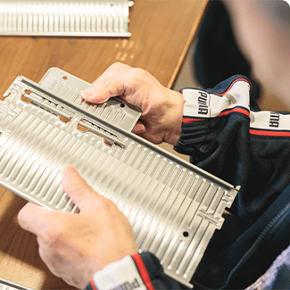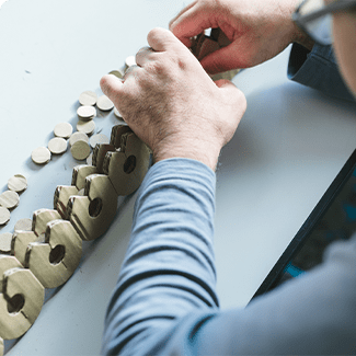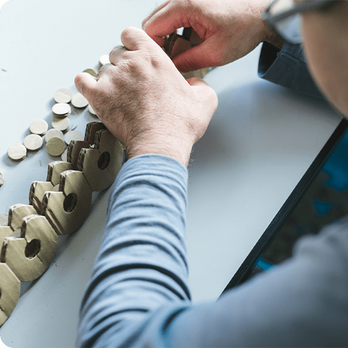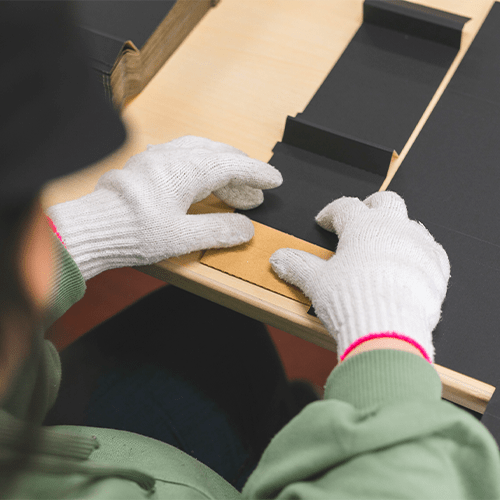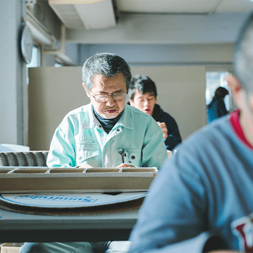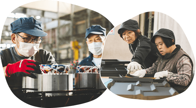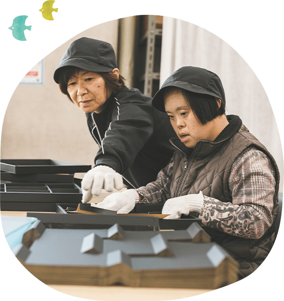 地域の企業から受注した進物用の箱折作業やモーター部品の絶縁処理・仕上げ、療育活動などを行っています。お一人おひとりの得意分野を引き出せるような支援を行うことを目指し、バリエーション豊富な作業訓練を行っています。