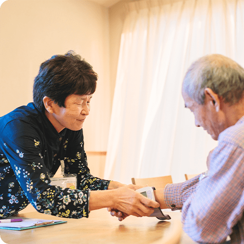 利用者の方が健康に過ごすことができるよう、看護師による問診やバイタルチェックなどの健康管理を行っています。また利用者の方からの健康相談もお受けしています。