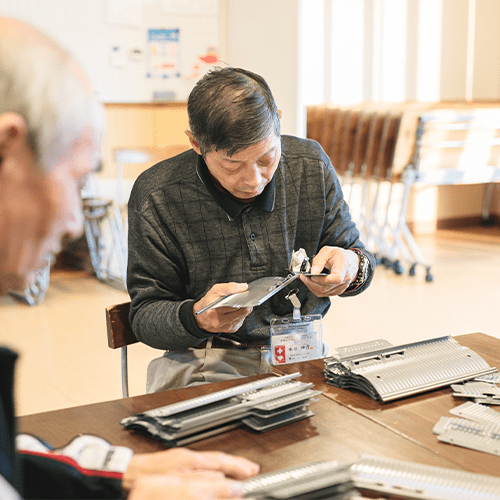 障がいや特性に合わせて取り組んでいただけるよう自動車部品の組み立てや防災備蓄用品の箱詰め、地域の清掃作業、ポスティングなど様々な作業訓練を行っています。また、作業訓練以外にも、リハビリや体操、散歩など、利用者の方の療育や体力づくりを目的とした活動も行っています。
