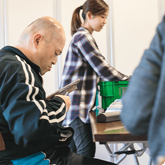 利用者の方が作業訓練を行う様子やリハビリ、余暇活動などを行う様子を見学いただきます。また、ご本人やご家族の方と面談を行い、身の回りのことなど支援する上でのご本人のご希望・状況を伺うことによって、適切なサービスを検討・提案します。