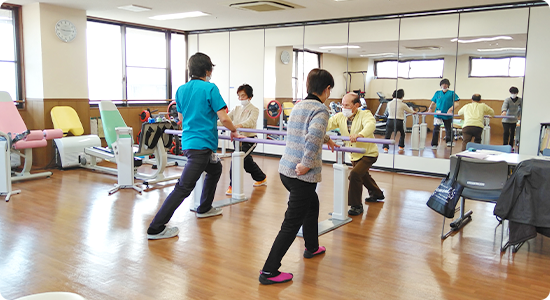 理学療法士は、利用者の方の生活における必要な運動能力の保持・向上のため、関節の可動域の改善や筋力を回復させる運動療法、ストレッチや温熱刺激を外部から与えることによって行うケアやリラクゼーションを行っています。そのほかにも、法人内の利用者の方だけではなく地域の方を対象に健康サポート教室を開催したり、高齢者スタッフを中心に身体の悩みの相談を受け、運動機能の維持改善、介護予防のフォローも実施しています。