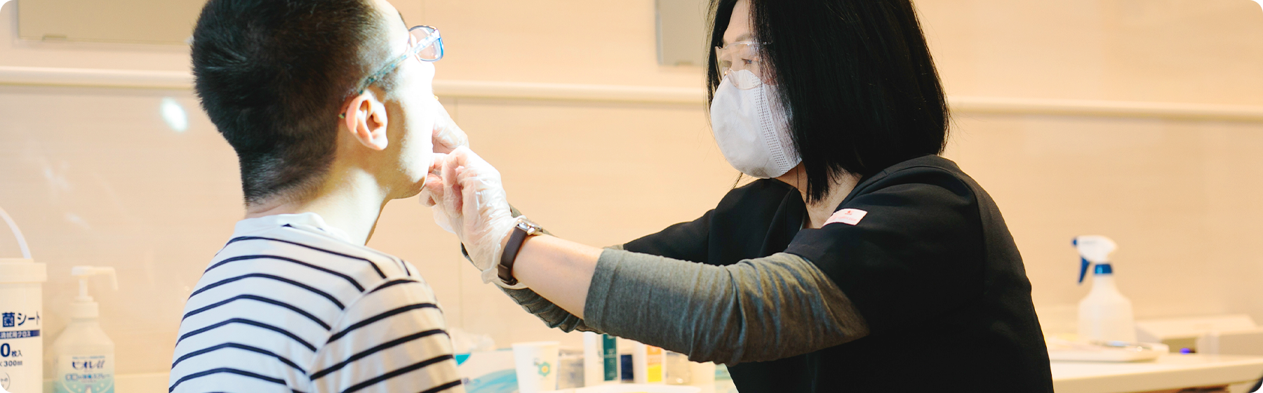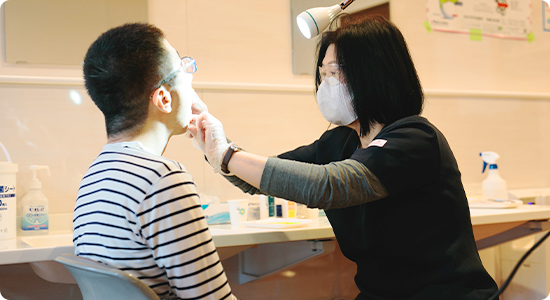 また、口腔内の炎症は、食事量の低下や感染症・発熱を引き起こす可能性があるため、歯科衛生士が利用者の方へ歯磨きの指導や磨き直しを行ったり、炎症がないかなどをチェックしています。そのほか、外部の歯科医師や歯科衛生士が訪問し、歯の検査や治療を行うことはもちろん、歯磨きの指導を職員に行うことによって、以前は歯磨きや磨き直しを拒否していた方が苦手を克服し習慣化するなど、利用者の方に変化が現れています。